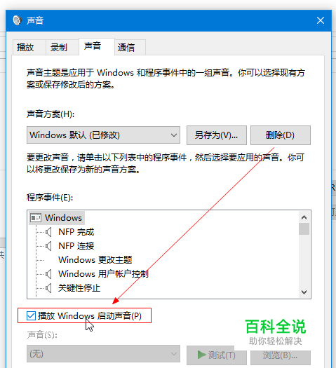 Windows 10 默认是没有启用开机声音的,所以需要先进入声音方案中勾选“播放 Windows 启动声音”。 Windows 10 直接右键点击任务栏右下角的音量图标,选择“声音”即可进入声音方案界面。