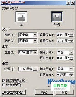 第2步,打开“图文框”对话框,在“文字环绕”区域选择“无”或“环绕”对齐方式;在“尺寸”区域设置图文框的宽度和高度;在“水平”和“垂直”区域设置图文框相对于栏、页面或页边距的精确位置;选中“随文字移动”复选框可以在图文框前面输入文字时,图文框自动下移;单击“删除图文框”则可以将其删除。完成设置单击“确定”按钮,如图所示。