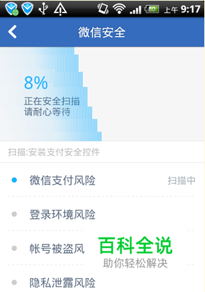 进入后,点击下方的安全扫描的按钮,管家就可以帮我们扫描手机上含支付、登陆、盗号、隐私等方面的安全隐患,值得一提的是管家也会在后台对微信进行实时地安全保护: