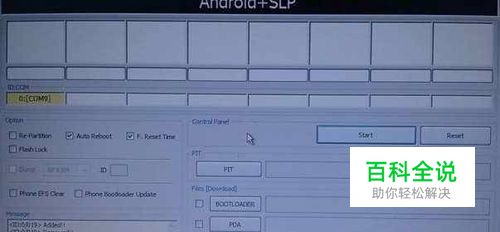 2.打开odin.exe程序,选择相应的文件和选项。这里要分两种情况: 情况一:如果刷机包内只有一个tar文件,如下图所示,点PDA选择该tar文件即可,其它默认,切记不要选择重分区(Re-Partition)和pit文件。 情况二:如果解压的文件夹内有4个文件,此时Re-Partition Auto Reboot F.Reset Time前全打上勾,选择对应的PIT, PDA, PHONE, CSC文件:点PIT 选择XXXX-s1_odin_20100XXX.pit 点PDA 选择XXXX_PDA_XXXX.tar(.md5) 点PHONE 选择XXXX_MODEM_XXXX.tar(.md5) 点CSC 选择XXXX_CSC_XXXX.tar (.md5) (XXXX表示略过)。