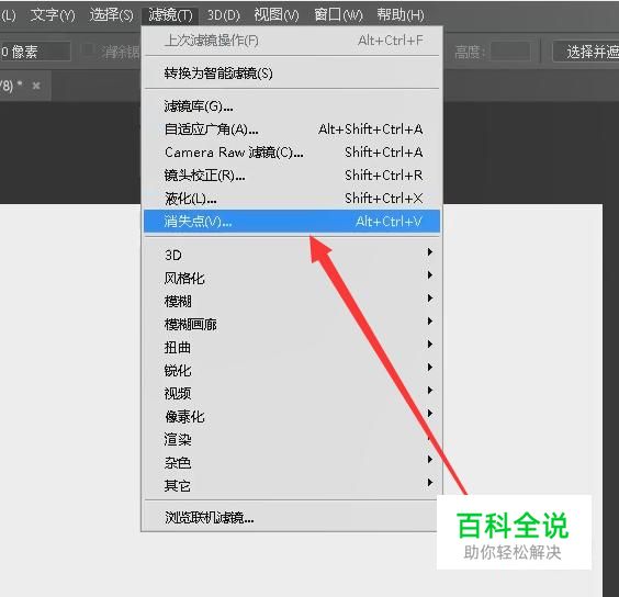 选中图层1,然后点击“滤镜”,选择“消失点”,如图所示。
