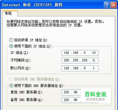 在桌面上找到“网上邻居”单击右键点“属性” → 双击“本地连接” → 点击“属性” → 在“本地连接属性”的此连接使用下列项目中找到“Internet 协议 (tcp/ip)”并双击 → 点击“在使用下面的IP地址”中输入如下: IP地址:192.168.0.10 (注:此处直接这样输入,路由器用户需要根据路由分配来输入) 子网掩码:255.255.255.0(注:此处会自动输入) 默认网关:192.168.0.1 (注:此处直接这样输入,路由器用户需要根据路由器的网关输入) 以下宽带用户可以不用输入(如果知道的情况下可以输入,不知道的情况下可以查询输入) 使用下面的DNS服务器地址: 首先DNS服务器地址:202.96.134.133 (这里以深圳电信DNS为例) 备用DNS服务器地址:202.96.128.166 (这里以深圳电信DNS为例)