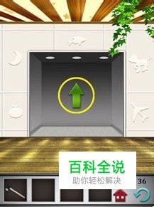 第三十六关,电梯门周围有鱼、狗、飞机、苹果、月亮五个图标,在电梯门上有一幅画,画的中间有一个向上的白色箭头。提示就隐藏在这幅图中,从水中到太空,玩家需要由下至上依次点击相应的图标即可打开电梯门过关。(鱼-狗-苹果-飞机-月亮)