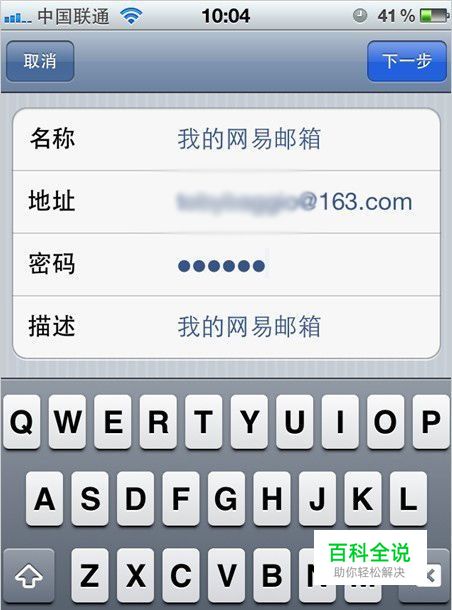 以163邮箱为例进行设置,126邮箱设置过程完全一样。有四个选项需要输入资料,“地址”和“密码”必填,“名称”和“描述”可以按照自己的需要和兴趣选择,可以填入中文名或英文名,或者自己邮箱帐号名。输入完毕后,点击“下一步”。