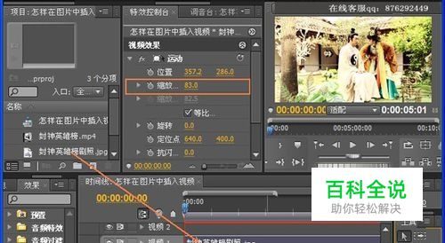 导入了素材之后就要把素材都添加到视频轨道上,用鼠标把图片拖拽到视频1轨道上,然后在效果控制台,点击运动打开下拉菜单,调整缩放比例,将图片缩放到与预览窗口相符。