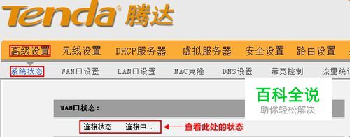 此时可以进到路由器设置页面(192.168.0.1),点击右上角的“高级设置”-“系统状态”根据WAN口显示的连接状态来判断自己的问题。