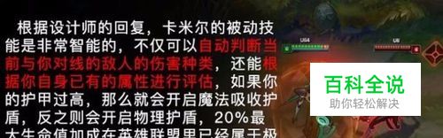 英雄技能截图 被动 自适应防御 对敌方英雄进行普通攻击,会获得一层护盾,所防御的伤害类型随着攻击目标而变化(物理或魔法),护盾数值为卡米拉最大生命值的20%,持续1.5秒。