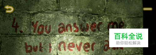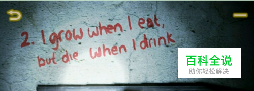 去钢琴房,对壁炉使用"木头"、"树叶"、"火柴"。 将"冰"放入"桶",丢进壁炉加热,再拿回"桶"。 去院子,开门,往模具上使用"桶",把模具捡起,丢进冰箱,再打开时,就可以得到"钥匙"。 上三楼,用"钥匙"来开第一个房间门。进入,在浴缸捡到"钥匙"。打开洗手盆的水,点击镜子,拍照。 座钟旁边的门,往左边走,第一个房间,开锁。拿到"马桶塞"。对墙上的文字拍照,一共是四张照片。往右边走,拿到"书"。 上三楼,厕所,使用"马桶塞",拿到"琴键"。 去钢琴房,修好钢琴,对钢琴上方的图,拍照。根据厕所镜子的照片和钢琴图的照片,去弹钢琴,dead 在钢琴前的桌子上,放入刚刚得到的"白字母"。 根据下图 当我年轻的时候,我很长;但当我老了,我会变短。答案是:蜡烛 candle 我吃东西的时候,会长大;但是当我喝水的时候,会死亡。答案是:火 fire 谈话会将我打破。答案是:沉默 silence 你会回答我,即使我从来都没有问过你问题。答案:打电话telephone 。你给别人打电话,却都会是别人回答"喂?