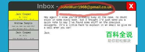 进入厨房,开冰箱,得到"冰"、"拼图"。 上三楼,进入第三个房间,点击衣柜,得到"拼图"。 打开蓝色箱子。打开箱子的推理过程:由(图1)可知箱子左边的密码是:date of birth 出生日期,根据邮件(图2)可知出生日期为1968。右边的密码是:key on usb ,但实际上真正的信息不在usb里面,而是在usb上贴的纸条(图3)this is the key ,就是说key 是英文this 。根据(图4)将shit 改变位置变成this ,那么字母下面的点就会随之改变为4183。所以!箱子的密码1968,4183。