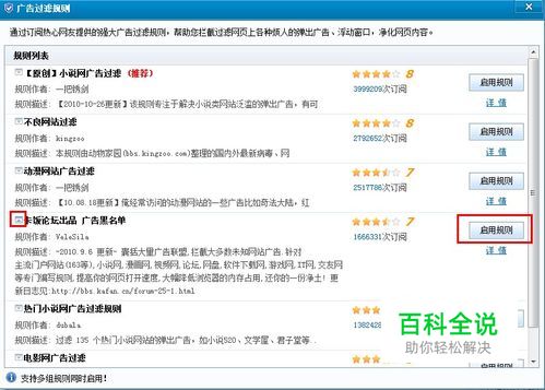 “设置”里含有常见的过滤规则:“小说网广告过滤”、“动漫网站广告过滤”和“电影网广告过滤”等,点击过滤规则左侧的“小三角”可以打开/隐藏该规则的描述信息。
