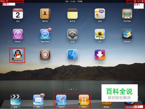 从下图我们可以看出,我的ipad上有3个程序在后台运行。分别是QQ,safari,ipod。这样我们就可以实现挂着QQ边听歌边浏览网页。是不是很爽呢?其实很简单,下面来跟我做。