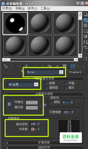 打开材质编辑器,选择一个材质球命名为Metal,展开“Shader Basic Parameters”(Shader基本属性)面板,将材质属性改为Metal(金属)方式;将材质的Diffuse设为灰色;然后改变Specular Level 参数为106左右(根据金属反光亮度来调节这个参数的强弱);Glossiness设为86左右。