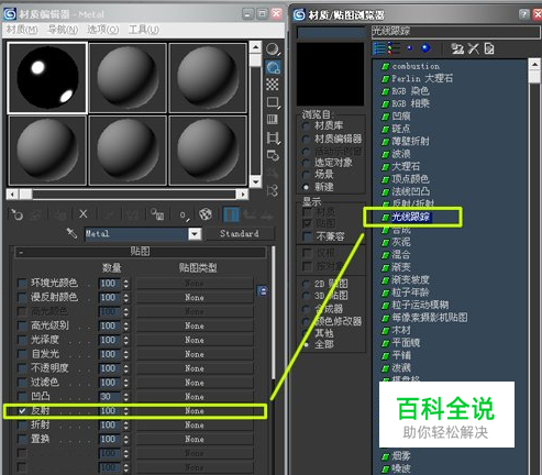在Reflection(反射)通道中添加一个Raytrace(光线跟踪)贴图,这样这个材质就具有了反射自身影像和周围物体的效果。光线跟踪不用设置任何参数就能达到很逼真的反射效果了,而且反射通道值设定在最大值100时,这个材质将100%无衰减地反射周围环境,充分突出不锈钢金属反光的特性。