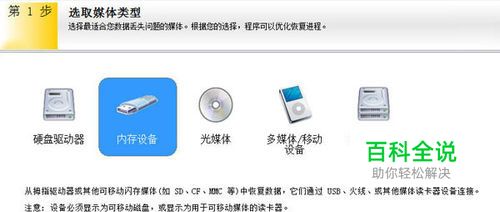 步骤二:打开EasyRecovery软件,可以看到软件的主界面,点击右下方的“继续”按钮,进入恢复照片的第一步,选择您要恢复的媒体类型。这里我们要实现“数码相机照片恢复”操作,所以选择“内存设备”。