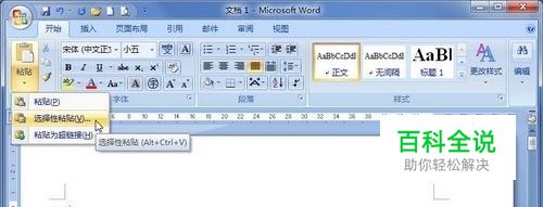 第2步,打开Word2007文档窗口,在“开始”功能区的“剪贴板”分组中单击“粘贴”下拉三角按钮,并在打开的下拉菜单中选择“选择性粘贴”命令,如图2011110316所示。 图2011110316 选择“选择性粘贴”命令