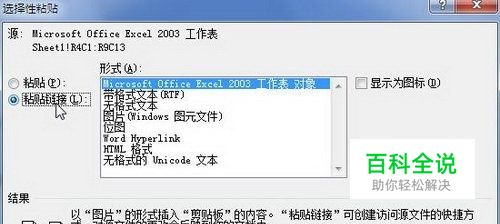 第3步,打开“选择性粘贴”对话框,在“形式”列表中选中“Microsoft Excel 2003工作表对象”选项,然后选中“粘贴链接”单选框,并单击“确定”按钮,如图2011110317所示。 图2011110317 选中“粘贴链接”单选框