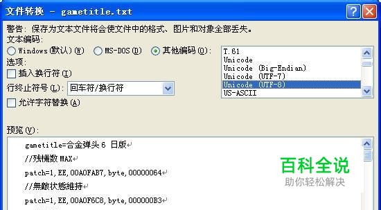 用word或写字板输入: gametitle=合金弹头6 日版//残機数MAXpatch=1,EE,00A0FAB7,byte,00000064//無敵状態維持patch=1,EE,00A0F6C8,byte,000000B3//手榴弹99patch=1,EE,00A0F705,byte,00000063//无限弹药patch=1,EE,00A0F708,short,0000FFFF保存为纯文本,编码为Unicode (UTF-8) 重命名保存的文件为5676f62f.pnach 放到cheat或patches(版本不同)文件夹中 然后开启作弊或补丁(有时候可能要在补丁浏览器里启用地址) 就是无敌状态了!