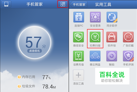 进入腾讯手机管家右上角键进入实用工具中,我们可以看到扣费扫描这个功能。