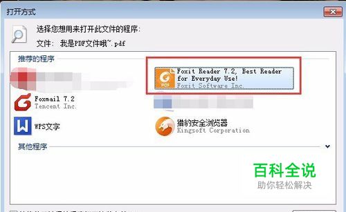 2.在推荐程序中,选择你常用的PDF阅读器(例如小编喜欢用福昕阅读器),再勾选左下角的“始终使用选择的程序打开这种文件”按确定,这样所有的PDF文件都会修改回你以前默认的程序打开了~