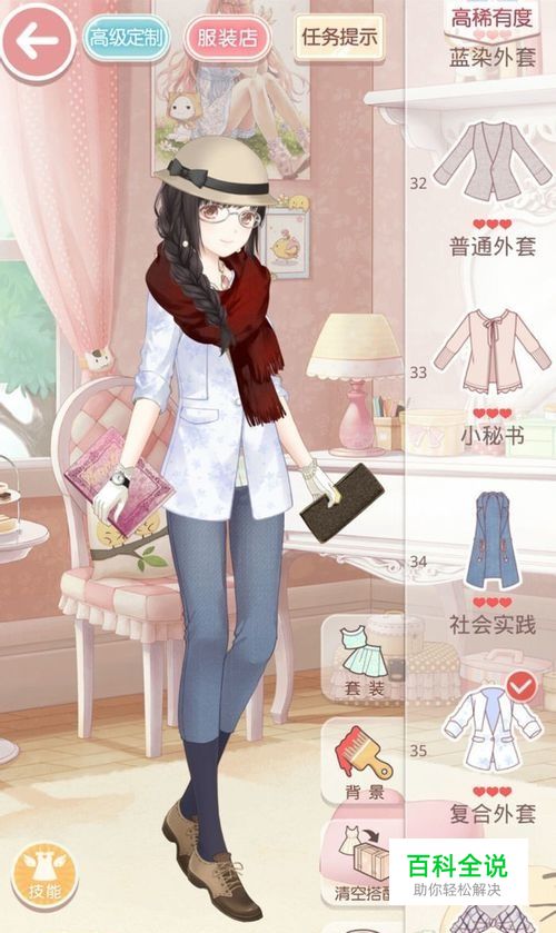 首先按照,金色音乐厅的搭配选了上图所示的衣服,但是发现,保暖属性太高了,如果全出清凉我就可以洗洗睡了!所以果断换了很多部件! 发型:窈窕淑女·黑(系统赠送) 上衣:红晕(6-5少女级) 下装:电视机(商店2961) 外套:复合外套(服装店68钻石或者用衬衣外套;设计总监代替) 袜子:过膝学生袜(商店1338) 鞋子:小绅士(商店6749) 头饰:午茶(商店2008) 耳饰:花开(公主4-12) 颈饰:节日气氛(公主2-支线2) 手饰:时间观念+海上珠链+丝绸手套(手饰随意搭配) 手持:真皮钱包+精装笔记本(商店购买) 妆容:北地英姿(商店5120) 腰饰:蔷薇链(完成成就) 特殊:近视眼镜(商店842) 这样搭配基本兼顾到了5个属性,达到了45000分,基本能保证90%+的胜利