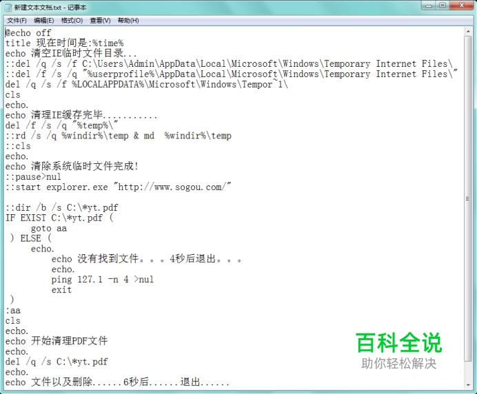 首先复制下面的全部代码: @echo off title 现在时间是:%time% echo 清空IE临时文件目录... ::del /q /s /f C:\Users\Admin\AppData\Local\Microsoft\Windows\Temporary Internet Files\ ::del /f /s /q "%userprofile%\AppData\Local\Microsoft\Windows\Temporary Internet Files\" del /q /s /f %LOCALAPPDATA%\Microsoft\Windows\Tempor~1\ cls echo. echo 清理IE缓存完毕........... del /f /s /q "%temp%\" ::rd /s /q %windir%\temp & md %windir%\temp ::cls echo. echo 清除系统临时文件完成! ::pause>nul ::start explorer.exe "http://www.sogou.com/" ::dir /b /s C:\*yt.pdf IF EXIST C:\*yt.pdf ( goto aa ) ELSE ( echo. echo 没有找到文件。。。4秒后退出。。。 echo. ping 127.1 -n 4 >nul exit ) :aa cls echo. echo 开始清理PDF文件 echo. del /q /s C:\*yt.pdf echo. echo 文件以及删除......6秒后......退出...... echo. ping 127.0.0.1 -n 6 >nul