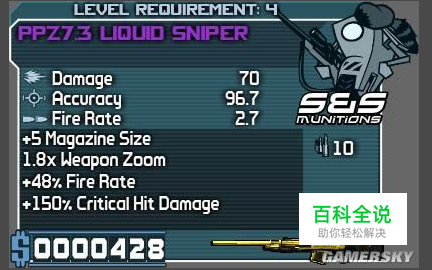 以下推出我要改的主角:一杆4级的狙击(我自己才15级,没见过什么好装备,大家要有好dd就把sav文件附在帖子里给我研究研究啊) 这里我更换了枪管和瞄准镜,所以作用体现在了杀伤、精准、放大倍数上。为啥不附加点属性啥的呢,因为好属性我也没见过,不知道咋写。 。 。 我倒是尝试增加了一个爆炸x2的属性但是暴击的属性就直接丢了,伤害也会减少20。很有可能这个游戏的武器附加效果的组件只能有4个,超出不报错,但是会丢掉,这把扑街枪没了暴击伤害再少掉20点伤害那就可以扔了,别的属性也都不能丢,所以忍痛没加爆炸x2。不过看看只要4级就可以用,还能说啥呢、、、、