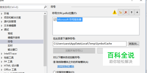 运行VS2013出现未加载kernelbase.pdb怎么处理? 在调试中选择“选项和设置”,如图在“符号”中的Microsoft符号服务器上打勾