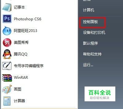 单击桌面开始按钮,找到“控制面板”并单击。如下图所示: