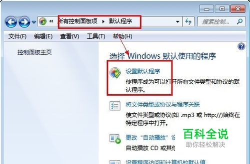 进到控制面板后找到“默认程序”并单击进入,接着在窗口右部单击“设置默认程序”,如下图所示: