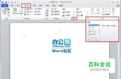 打开Word文档,在“页面布局”功能栏里找到“段落”窗口按钮,点击。