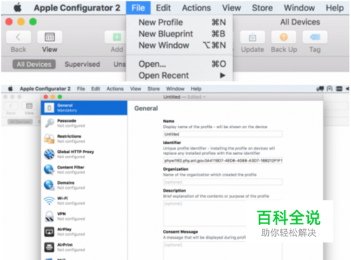 打开"apple configurator 2",新建一个profile,如图。然后在“general”,“name”里面取一个名字。这个名字会出来在ios的profile列表里面。比如以字体名称为名,“Calibri Fonts”。