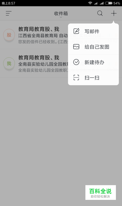 新建一封邮件: 打开APP并且登陆自己的邮箱,点击右上角“+”号,在菜单中选择“写邮件”。