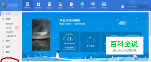 【打开软件】相信很多人都使用到【电脑管家】,我们打开电脑管家,如下图红色线框内所示;选择【软件分析】--选择【我的手机】。其实这是调用电脑管家附带的手机辅佐软件,如果没安装电脑管家或应用宝,也可以用其它手机辅助软件,功能类似;