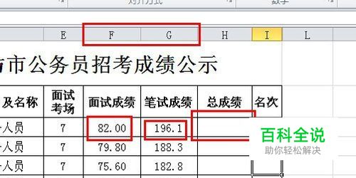 我们要求总成绩即F列的面试成绩加上G列的笔试成绩之和。