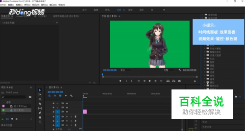点击效果面板,点击视频效果,点击键控,将颜色键拖到素材上。