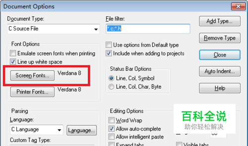 在新打开的文档操作窗口中,可以看到“Screen Fonts(屏幕字体)”默认设置为Verdana 8号字体,明显太小了。点击“Screen Fonts”按钮,打开设置字体界面。