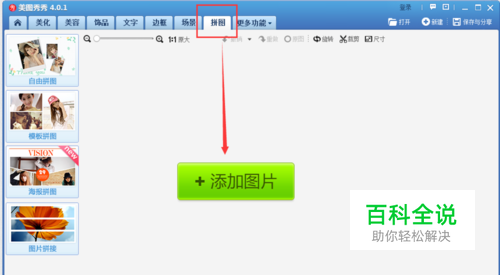 点击菜单栏的“拼图”按钮,然后点击页面中间的“添加图片”。