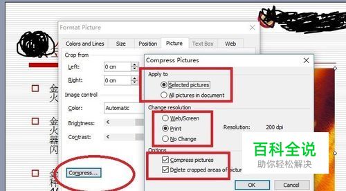 选择压缩,弹出的窗口中做好选择。第一个是对整个ppt还是只对选择的图片进行操作,根据你的需要来;第二个是压缩的分辨率,如果要压到最小就选第一个;第三个两个选项都选上,确定经过议会就压好了