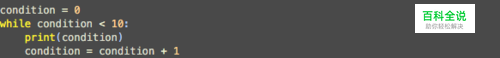 输出的结果将是 0, 1, 2, 3, 4, 5, 6, 7, 8, 9, 第一行设置 condition 的 初始值为 0,在进行 while 判断的时候 0 < 10 为 True, 将会执行 while 内部 的代码,首先先打印出该值,然后将 condition 值加 1,至此将完成一次循环;再 condition 的值与 10 进行比较,仍然为 True, 重复如上过程,至到 condiiton 等于 10 后,不满足 condition < 10 的条件(False),将不执行 while 内部的内容 所以 10 不会被打印。