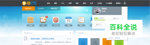 (此处以IBOS V3为例)进入OA系统后,将鼠标移至办公首页右上角的头像上,在弹出的菜单中点击“管理”,然后进入OA后台