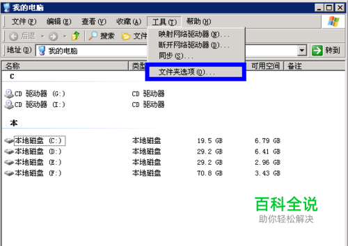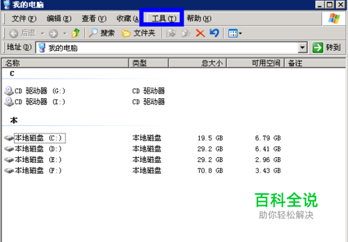 打开“我的电脑”,点击菜单栏中的 “工具”选项,如图所示