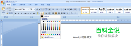 方法一:此种方法最为简单,只要把文字颜色调为白色就行。具体操作是:选中你需要隐藏的文字,然后点击“开始”菜单的文字颜色选项,在其中找到白色就可以了。