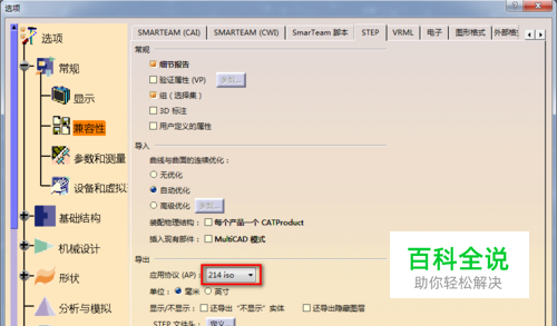 设置界面打开后,点击左侧“常规”——“兼容性”,然后从界面上部找到选项卡“STEP”,将导出选项下的应用协议(AP):更改为"214iso",点击右下角确定,就可以了。赶快试试吧。