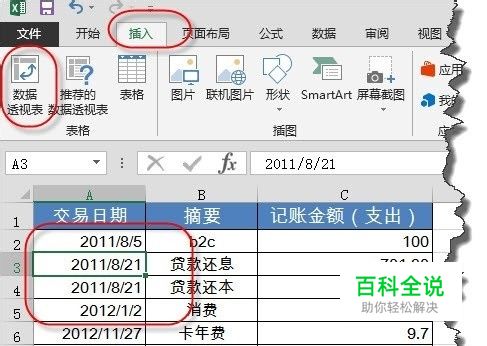 如图所示,在“数据透视表字段”将“交易日期”和“记账金额(支出)”拖动到如图位置。