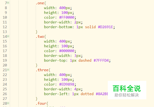 第五步,添加第三个div样式,设置左边框样式, .three{ width: 400px; height: 100px; color: #ED9898; border-width: 4px; border-left: 1px dotted #8A2BE2; } 如下图所示: