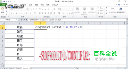 左键单击B1单元格,输入公式=SUMPRODUCT(1/COUNTIF(A2:A15,A2:A15)),按ENTER键后得到结果。