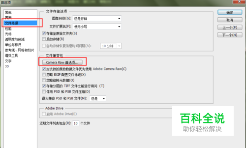 然后,点击界面左侧的【文件处理】,在右侧窗口中点击【Camera Raw首选项】