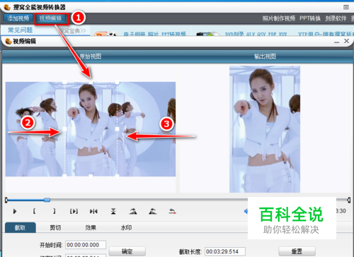 再点上面的【编辑视频】可以把画面的左右边界往中间推,直到右面的输出图的视频左右上下没有黑边为止。最后点击【确定】。