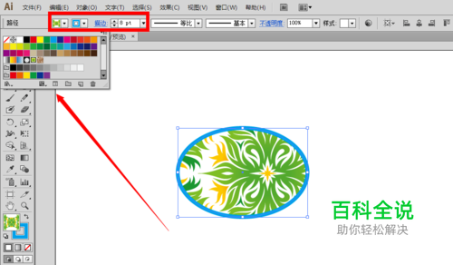 比如我们随意在画布上绘制一个椭圆形图形,并且填充植物图案,青色描边,8pt粗细
