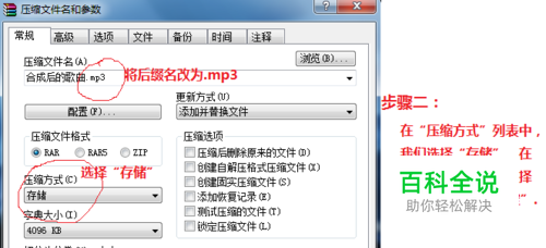 ,按住Ctrl+A键将这些MP3文件全选,然后单击鼠标右键,在弹出菜单项中点击“添加到压缩文件”,在弹出对话框中的常规选项卡下的“压缩文件名”列表中,输入一个文件名,例如“喜爱歌曲联唱.MP3”,一定要注意扩展名.MP3,在“压缩方式”列表中,我们选择“存储”,在“压缩格式”中,选择“RAR”,点“确定”